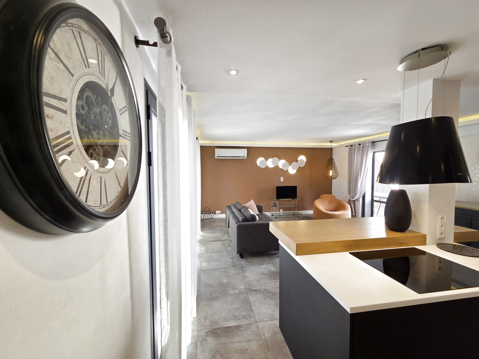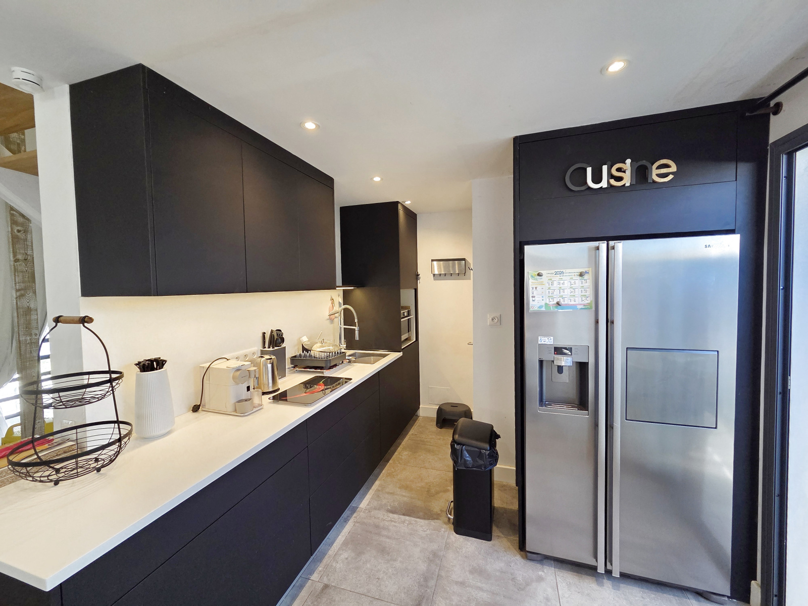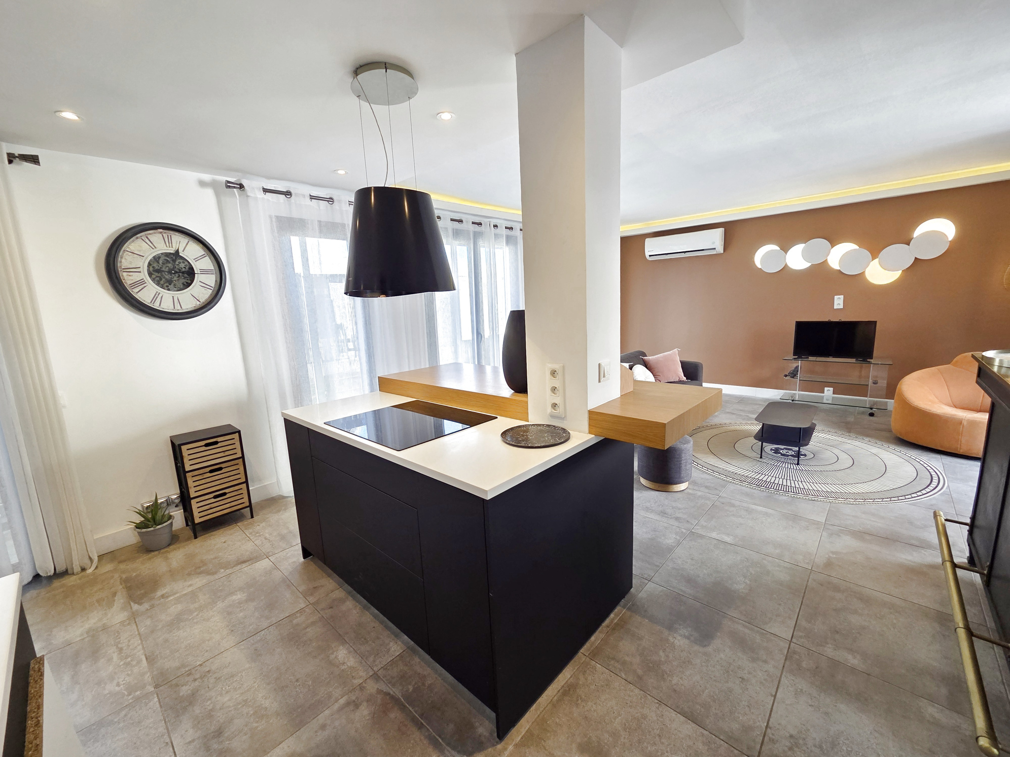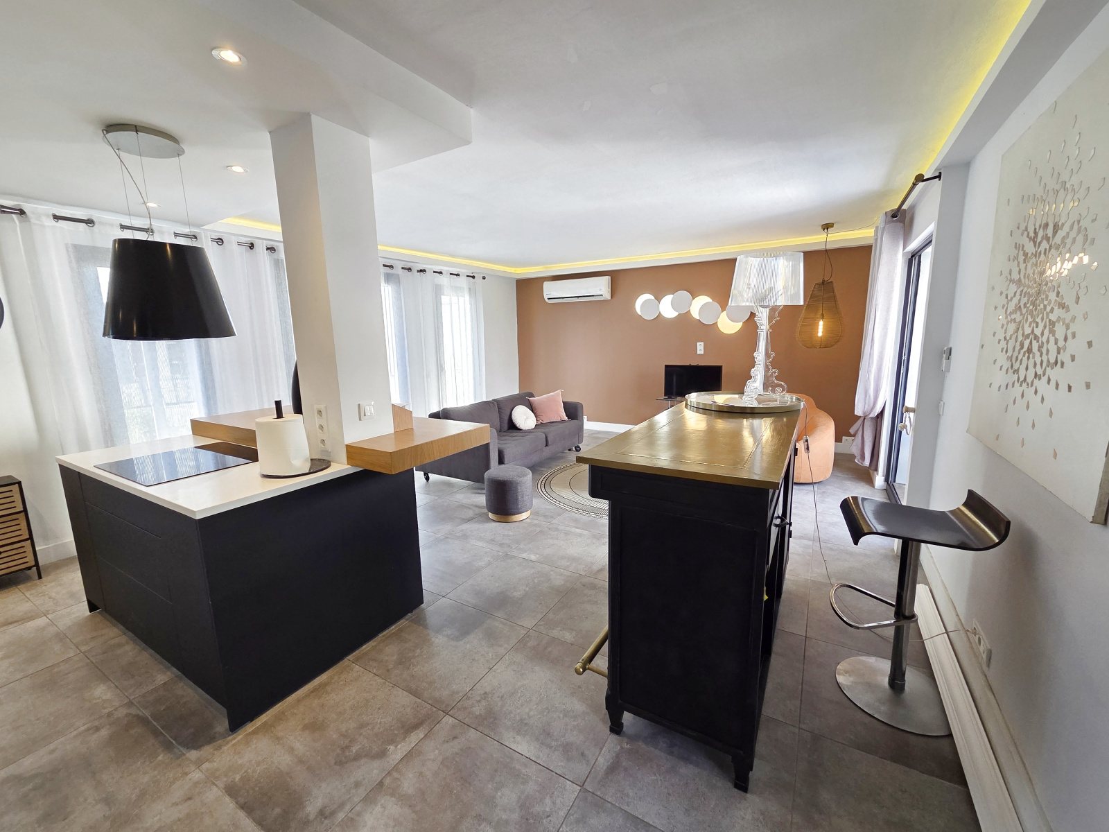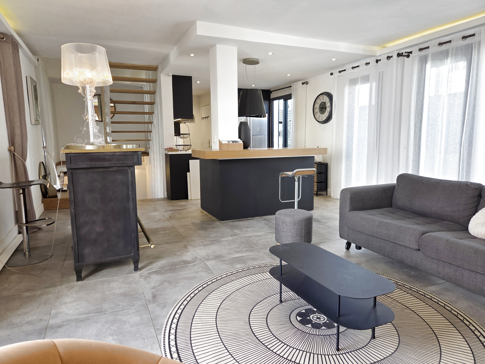 - au RDC par une porte sécurisée, rangement sous l'escalier et accès au 1er niveau sur un vaste séjour-cuisine proposant plus de 40m² très bien aménagé, traversant, avec nombreuses ouvertures sur balcon d'un côté et terrasse de près de 25m² de l'autre. La cuisine, très bien aménagée et meublée, avec plan et ilot central, frigo américain et électroménager, permet une utilisation optimale. 2 céliers dont 1 avec lave-linge et sèche linge et l'autre permettant de stocker et ranger, et un cabinet de toilettes.